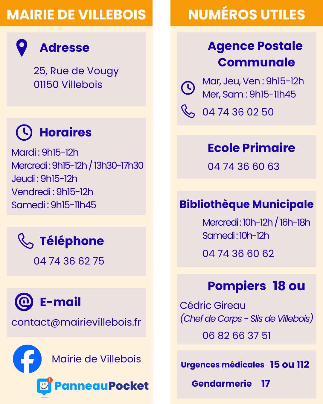 Suivez l’actualité de la commune : https://www.facebook.com/MairiedeVillebois